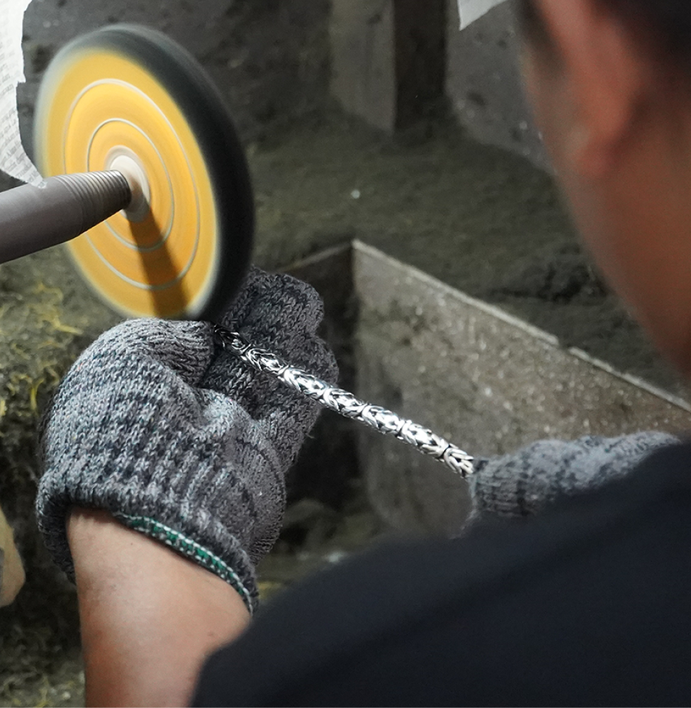 The more you wear it, the more it becomes yours. Your piece will darken over time and develop a more matte finish. That’s sterling silver oxidizing from your skin and daily wear. Some customers prefer big and old and never take their pieces off. Others keep them polished longer by storing them properly. There’s no wrong answer. Every person wears this differently.